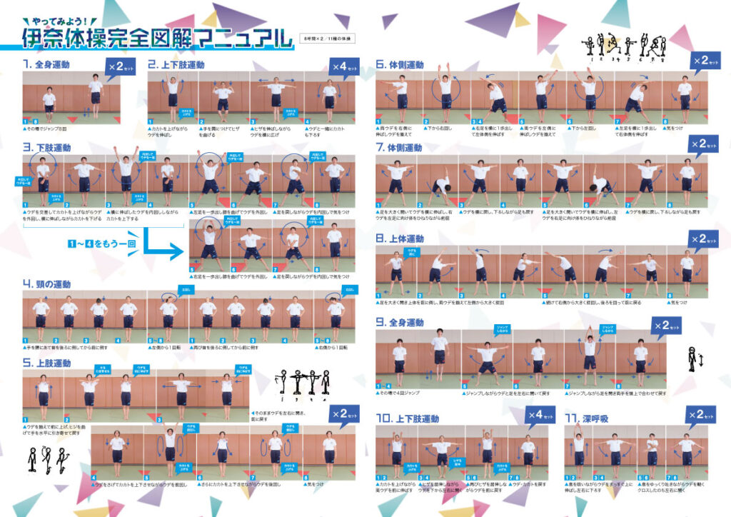 伊奈体操は在校生にとって、おなじみ・定番の自校体操。正式名は「伊奈学園体操」で、愛校心を高める意味もあり作られたらしい。開校当初になっかったのは確かなようだが、残念ながら年を重ねた1ケタ期の卒業生は記憶が曖昧…。ただ今回の取材で、スポーツ科学系に残され、代々、新入生に配られていた“体操の図解“が、前ページで登場いただいた田中稔先生の直筆ということが明らかに!